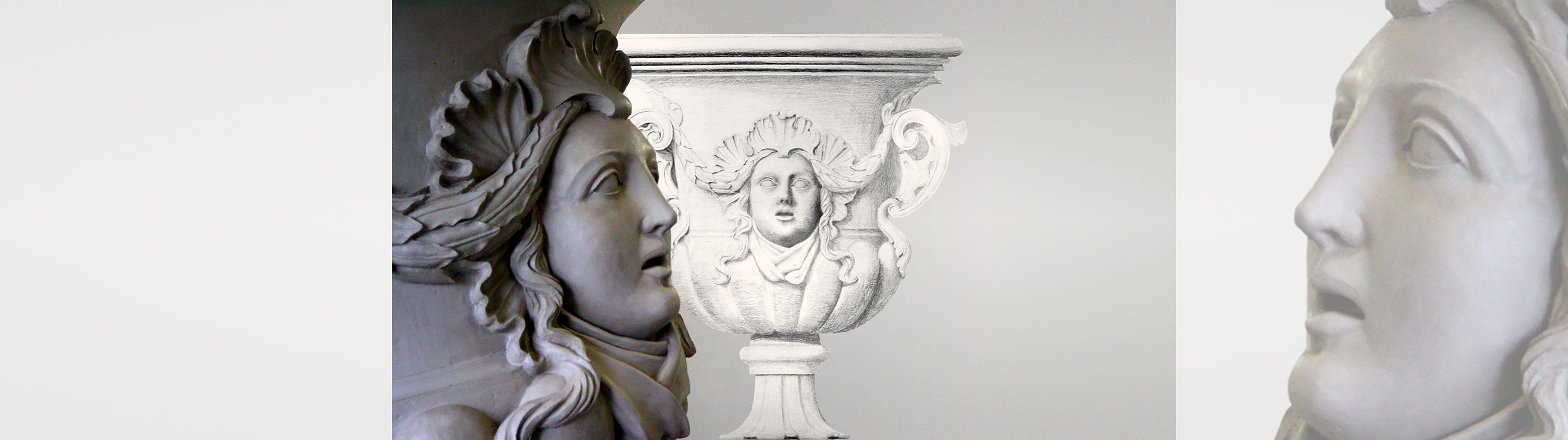 Vasque de style Louis XIV. Moulage en terre à gauche et dessin grandeur nature,