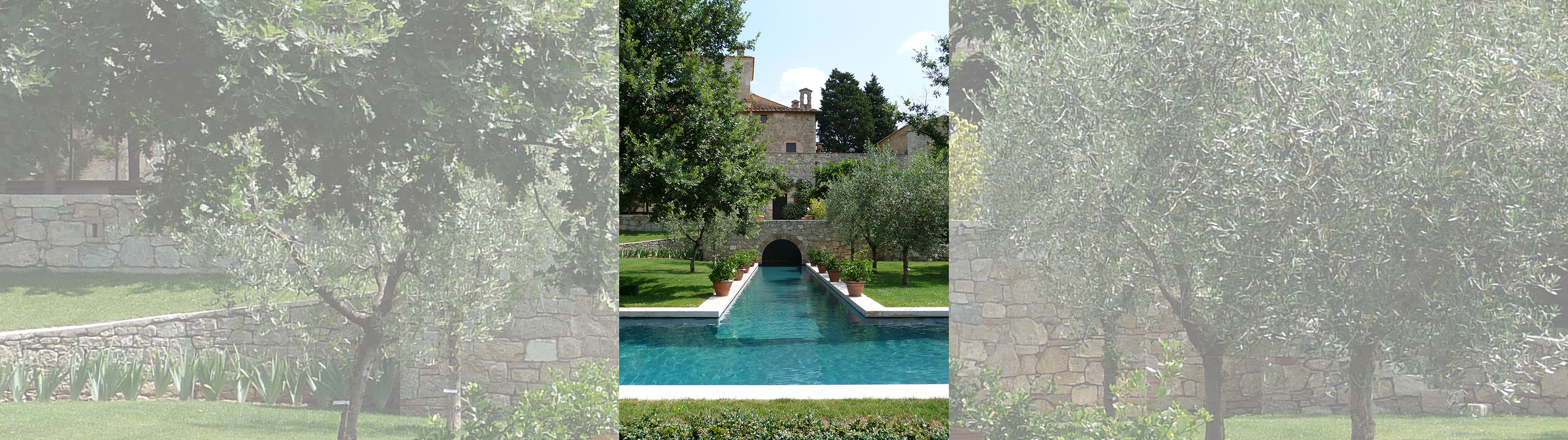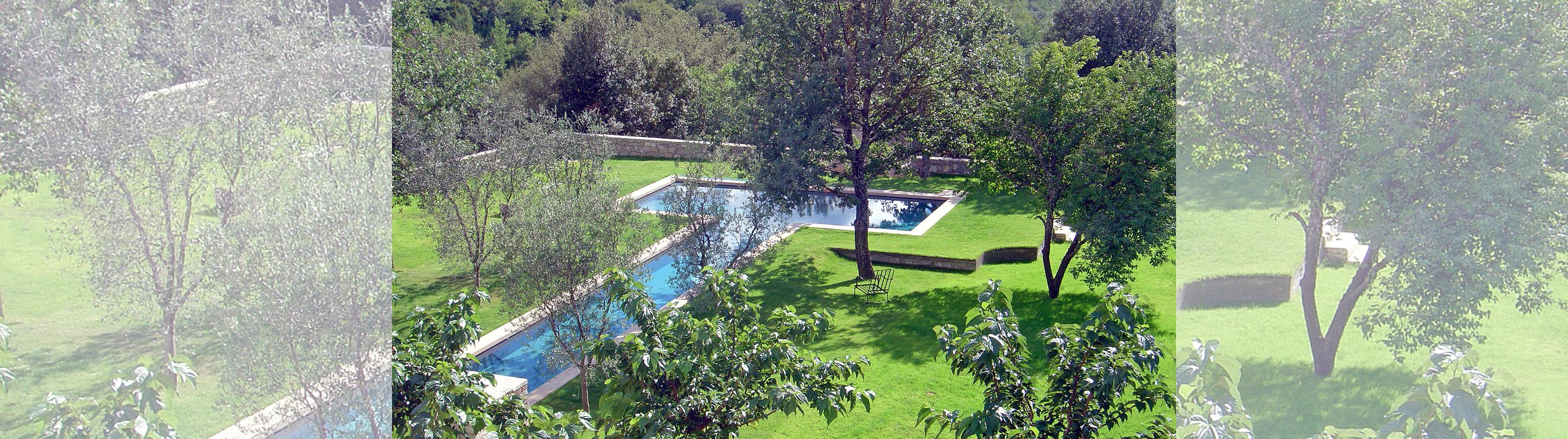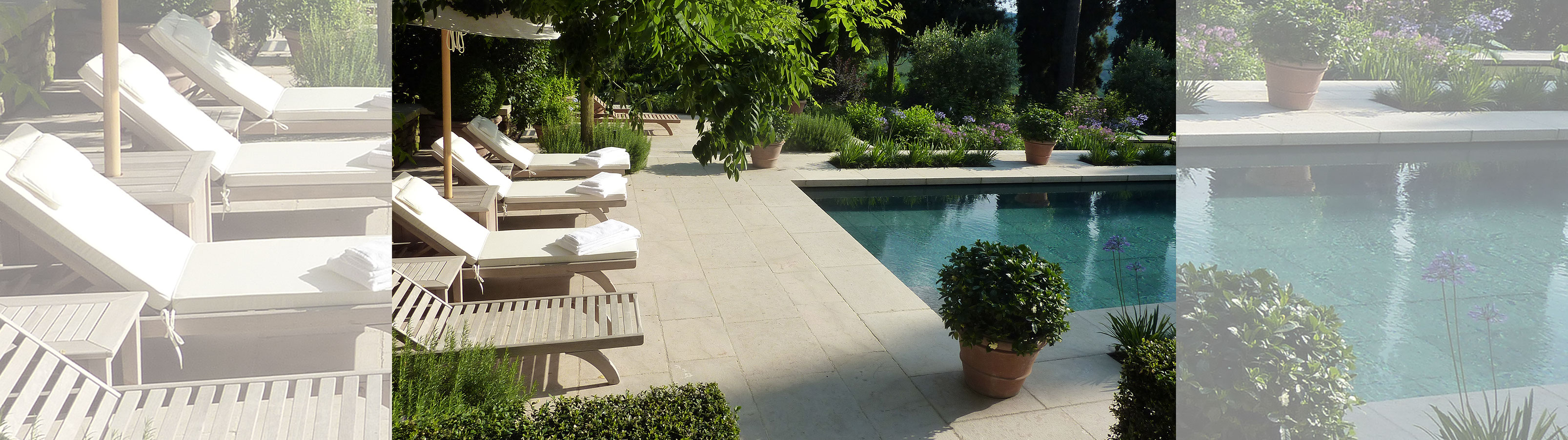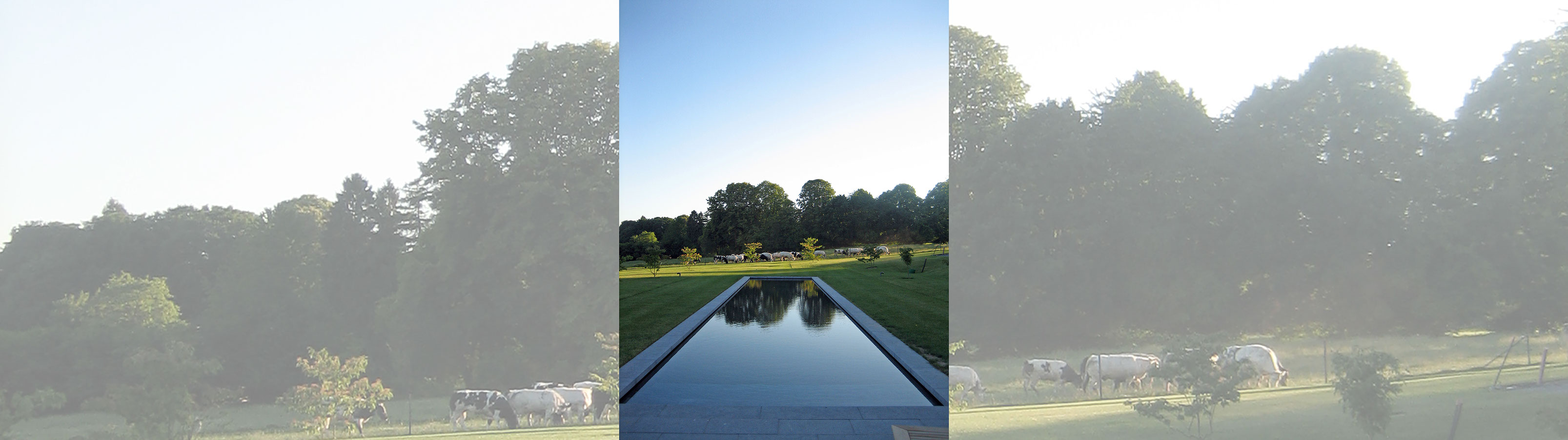 Souvent intégrées dans un espace traité comme un jardin, les piscines de François Goffinet rappellent les étendues marines aux eaux profondes : ces nuances outremer obtenues par des revêtements foncés et notamment un dallage de pierre bleue, redonnent à l’eau son naturel. Mises en valeur tel un canal, elles s’intègrent alors dans un paysage structuré où l’eau redevient miroir du ciel.