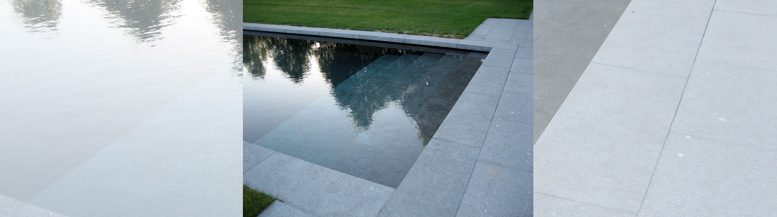 Piscine réalisée avec un fond revêtu de pierre bleue